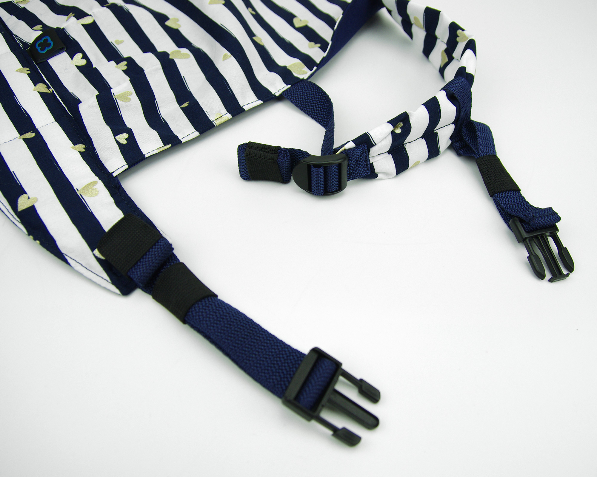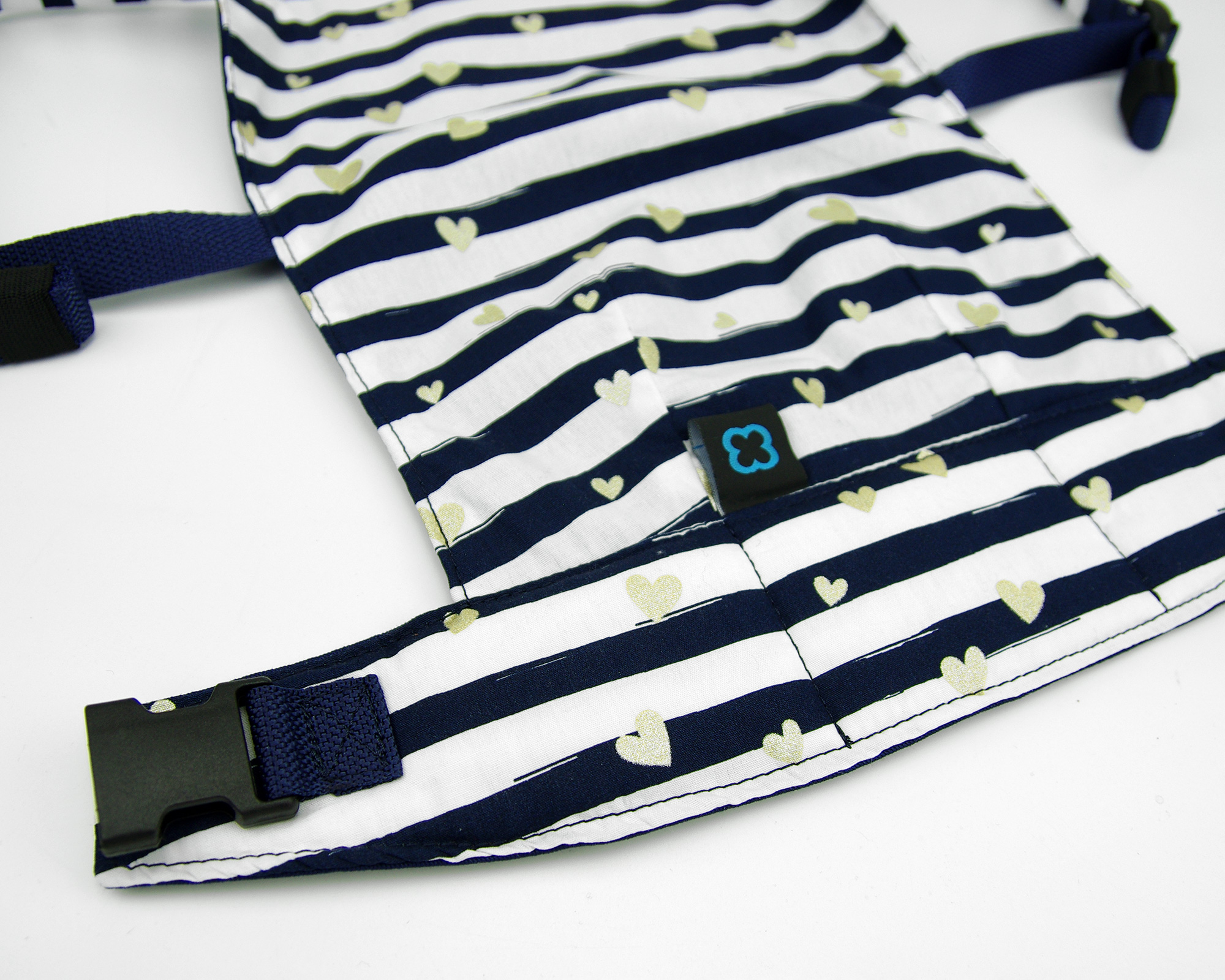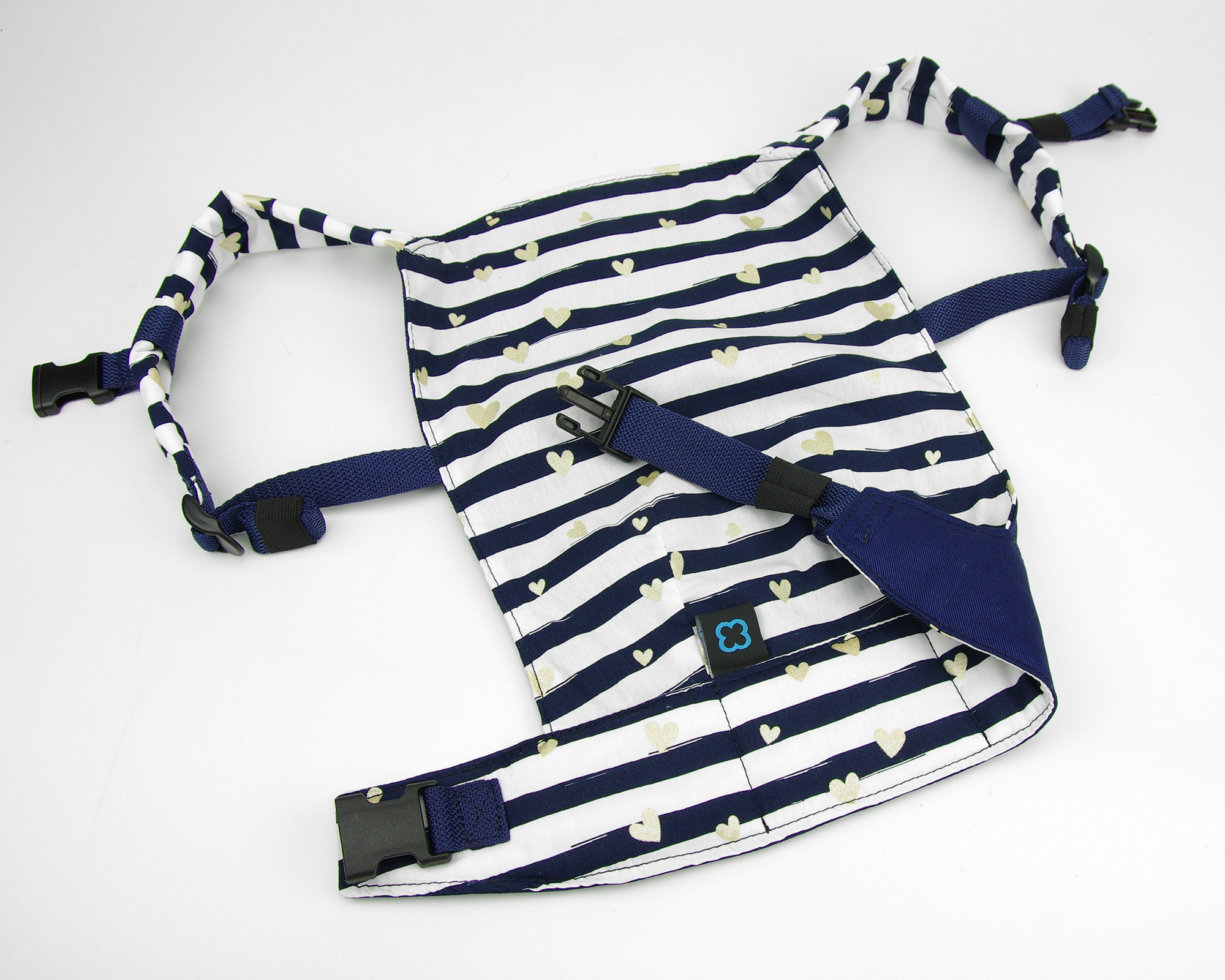 Dokonalá kopie nosítka na nošení dětí pro vaše dítko a jeho plyšáka nebo oblíbenou panenku. S hrudním páskem, aby malému rodiči nepadalo z ramen 🙂 Kombinace bavlněné dekorační látky s tmavě modrými pruhy a metalickými zlatými srdíčky a bavlněného kepru. Nově s tenčími popruhy, které ještě lépe sedí malé dětské postavě.